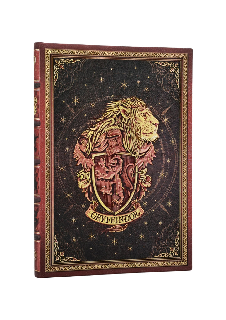 - Harry Potter'ın Büyülü Dünyasına Adım Atın. 11 yaşındaki Harry Potter, Hogwarts Cadılık ve Büyücülük Okulu'nda Anahtarlar ve Topraklar Bekçisi Rubeus Hagrid ile tanıştığı andan itibaren maceraları popüler kültürde silinmez bir iz bıraktı. Bugün, 25 yıldan uzun bir süre sonra, Harry Potter fenomeni tarihin en başarılı ve en sevilen eğlence mekanlarından biri olarak varlığını sürdürüyor. Bizimkinden ayrı ama aynı zamanda paralel bir evren olan büyücülük dünyası, cadılar, büyücüler ve sıra dışı yaratıklarla dolu, süpürgelerin uçuştuğu, kazanların kaynadığı ve maceraların sizi beklediği gizli ve büyülü bir dünyadır. Büyünün büyüleyiciliğine rağmen, aydınlık ve karanlık, doğru ve kolay arasındaki seçimler hâlâ geçerliliğini koruyor ve geleceğin rotası da bu seçimlerde şekilleniyor. Kendinizi Quidditch sahasında cesur Gryffindor'ların cesaretiyle mi yoksa hırslı Slytherin'lerin kurnaz taktikleriyle mi hayal ediyorsunuz? Yoksa bilge Ravenclaw'lar ve çalışkan Hufflepuff'lar gibi uzun koridorları ve büyüleyici kütüphaneleri mi tercih edersiniz? Harry Potter Koleksiyonumuz, Hogwarts Cadılık ve Büyücülük Okulu'nun sunduğu tüm harikaları keşfetme ve okul binanızın gururunu somutlaştırma şansı sunuyor. Harry Potter Koleksiyonu Paperblanks günlüğünüz, kendi büyülü deneyimlerinizi belgelemeniz için yaratıcı bir yol arkadaşı. Gryffindor, cesur yüreklere ve cüretkâr zihinlere ev sahipliği yapar; öğrencileri cesaretleri, yiğitlikleri ve sarsılmaz kararlılıklarıyla diğerlerinden ayrılır. Güçlü aslan arması, öğrencilerin cesaretiyle kükrer ve Paperblanks günlüğünüzün en ön saflarında yer alır. Harry, Hermione ve Ron, her maceraya korkusuzca eşlik ederek Gryffindor'un ruhunu temsil ediyor. Gryffindor gururunuzu bu günlüğün sayfalarında ifade edin.